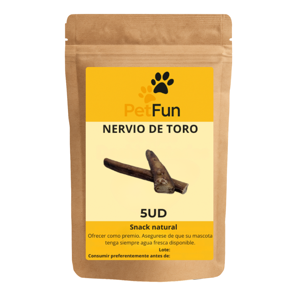 El nervio de toro deshidratado es un snack 100% natural, ideal para perros medianos, grandes o con mandíbulas fuertes. Su grosor de 1-2 cm y longitud de 15 cm lo convierte en una opción perfecta para la masticación, ayudando a reducir el estrés, el aburrimiento y favoreciendo la higiene dental.